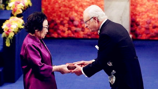 北京時(shí)間12月10日23時(shí)10分,2015年諾貝爾獎(jiǎng)?lì)C獎(jiǎng)典禮在瑞典斯德哥爾摩音樂廳隆重舉行,屠呦呦從瑞典國王手中接過了諾貝爾生理學(xué)或醫(yī)學(xué)獎(jiǎng)證書。