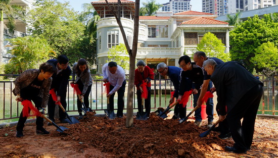 活動現(xiàn)場,郭蘭英老師與白云山潘高壽董事長、總經(jīng)理楊東升,黨委書記蘇廣豐,紀(jì)委書記王靜文,副總經(jīng)理劉永忠、盧其福,監(jiān)事會主席、工會主席陶躍良一同植下“無憂樹”。郭蘭英藝術(shù)發(fā)展基金會郭世珍副會長、郭文理事、歐陽海妮秘書,郭蘭英藝術(shù)學(xué)校校友會會長孫霏霏、劉小聰、副會長陳昊等共同參與。